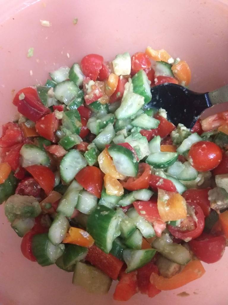 Chop and prepare the salad ingredients below, then place them into a bowl.