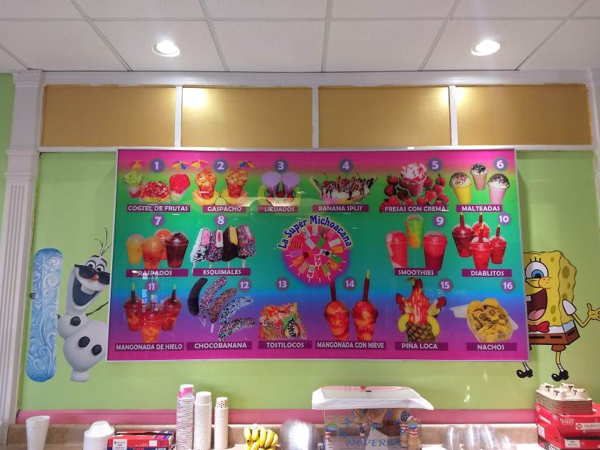 45-degree weather didn’t stop me from satisfying my sweet tooth at the heladeria (ice cream shop) known as La Super Michoacana today. I’d seen a lot of positive press about this dessert spot hidden in a strip mall, but had never gotten the chance to try it. We finished lunch at our favorite Vietnamese restaurant and plugged the address into the GPS – it turns out it was only a few steps away and we had never even seen it because it’s so well hidden. Once you find it, the exterior will surely catch your eye with its bright and inviting colors and matching truck outside!