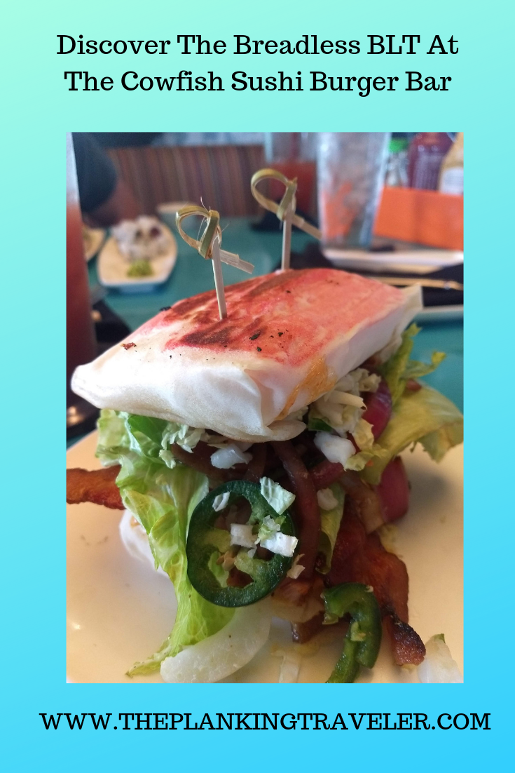 Let’s get something out of the way. I eat bread. In fact, I LOVE bread, but this unique breadless BLT sandwich at The Cowfish is just too good not to share. This post is mostly to showcase our tantalizing foodie photos, but if you haven’t heard of this delicious sushi burger fusion restaurant, they have locations in North Carolina (Raleigh and Charlotte), Florida (Orlando) and Alabama (Birmingham). In addition to what you’ll see in this post, they have a wide variety of sushi, burgushi, bento boxes, and outstanding milkshakes. I am in no way affiliated or compensated by The Cowfish for this post, I just love their unique take on Asian fusion!