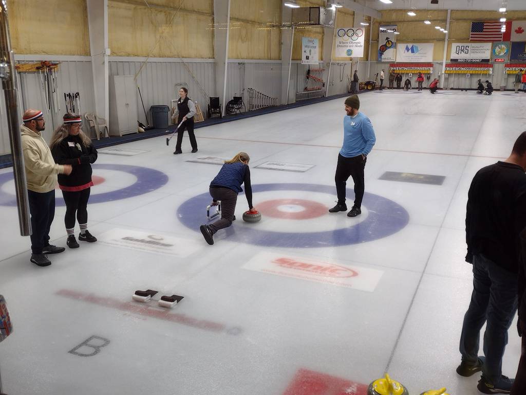We were then divided into groups of 8 and headed down to the ice where our instructors went over safety rules and first taught us how to sweep. After that, we took turns learning how to throw the rock. The move requires a deep lunge and was definitely harder than I expected to balance my body without slipping and get enough power to get the rock going far enough.